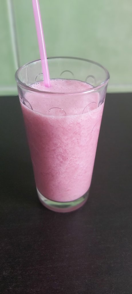Ingrediente: 2 linguri zmeură (eu am avut congelata), 1 banana coaptă, zeama de la o jumătate de lămâie, 2 linguri sirop de macese (puteti pune alt fel de sirop,miere sau deloc), 300 ml băutura din migdale( puteti pune lapte sau alta băutura din soia,alune,etc)