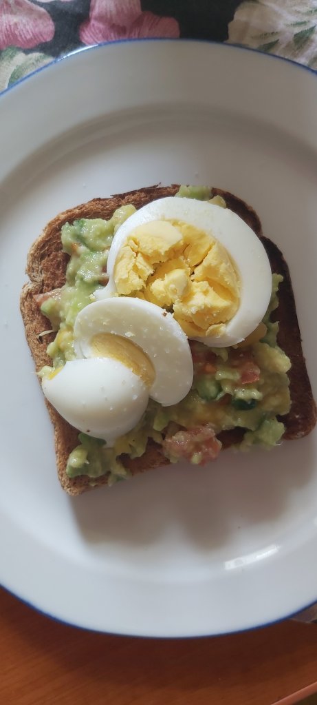 Am pus ouăle la fiert si pâinea la prajit. Am tăiat avocado in doua, am scos sîmburele si pentru a scoate miezul din coajă am folosit o lingură si a iesit foarte repede si bine. L-am pasat cu o furculița pe o farfurie si am pus zeama de lămâie peste el. Am tăiat castravetele si roșiile in cubulete cât mai mici si le-am adăugat intr-un castron, am pus boabele de porumb fiert si avocado, am adăugat sare si piper si am amestecat. Pe o farfurie am pus o felie de pâine prăjită, am adăugat salata si felii de ouă fierte si putina sare. Pofta buna.