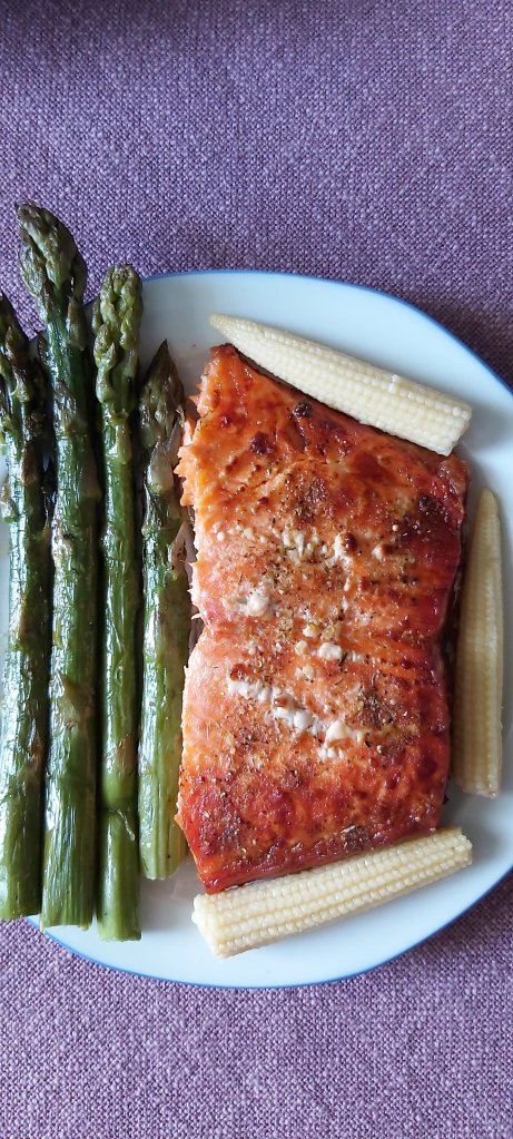 Ingrediente: 1 file pastrav somonat, 1 mănunchi sparanghel, ulei masline, condimente peste, condimente diverse ( sare, piper, oregano, busuioc, praf de usturoi)