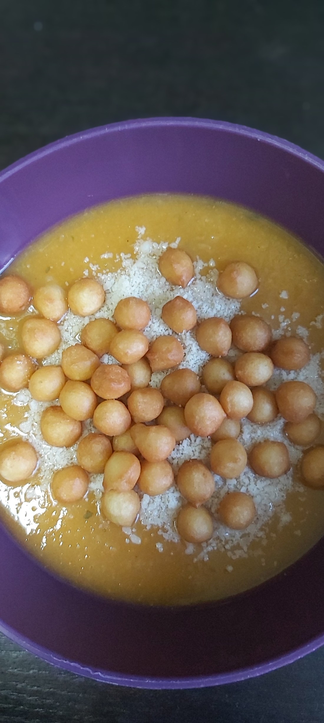 Ingrediente: 1 cartof, 1 cartof dulce, 1 morcov, în jur de 200 g mix de brocoli si conopidă, condimente, o lingură de parmezan si o mână de crutoane
