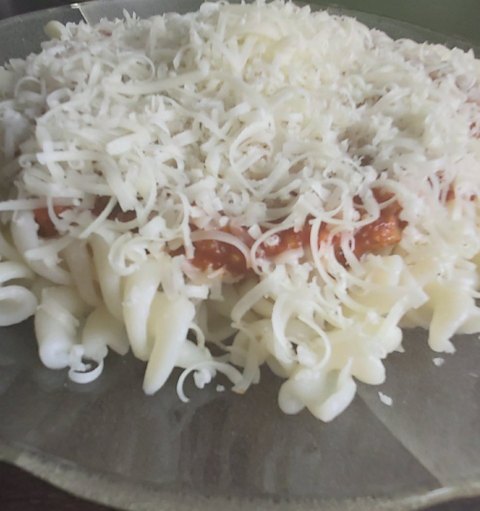 Mod de preparare: am pus o oala cu apa pe foc, am pus un praf de sare in apa si am lasat-o sa fiarbă. Am curățat si dat pe razătoarea mica morcovul si dovlecelul, am tocat ceapă mărunt și le-am adăugat in tigaie impreuna cu uleiul de măsline, le-am călit foarte putin doar cât să absoarbă legumele uleiul (nu imi plac legumele calite in ulei) , am pus o cana de apa peste ele , cand s-a evaporat apa am pus supa si sucul de rosii, am mai lăsat putin la fiert, cand totul era aproape gata am adăugat pasta de tomate, a mai dat in cateva clocote si am adăugat condimentele, am mai lăsat putin sa fiarbă si am stins focul. Intre timp cand apa din oala a inceput sa fiarbă în clocot am adăugat pastele si am amestecat din cand in cand sa nu se lipească, au fiert cam 15-20 min, le-am scurs si le-am împărțit în 2 farfurii, am pus sosul peste si am ras cascaval pe razatoarea mica. Pofta buna!